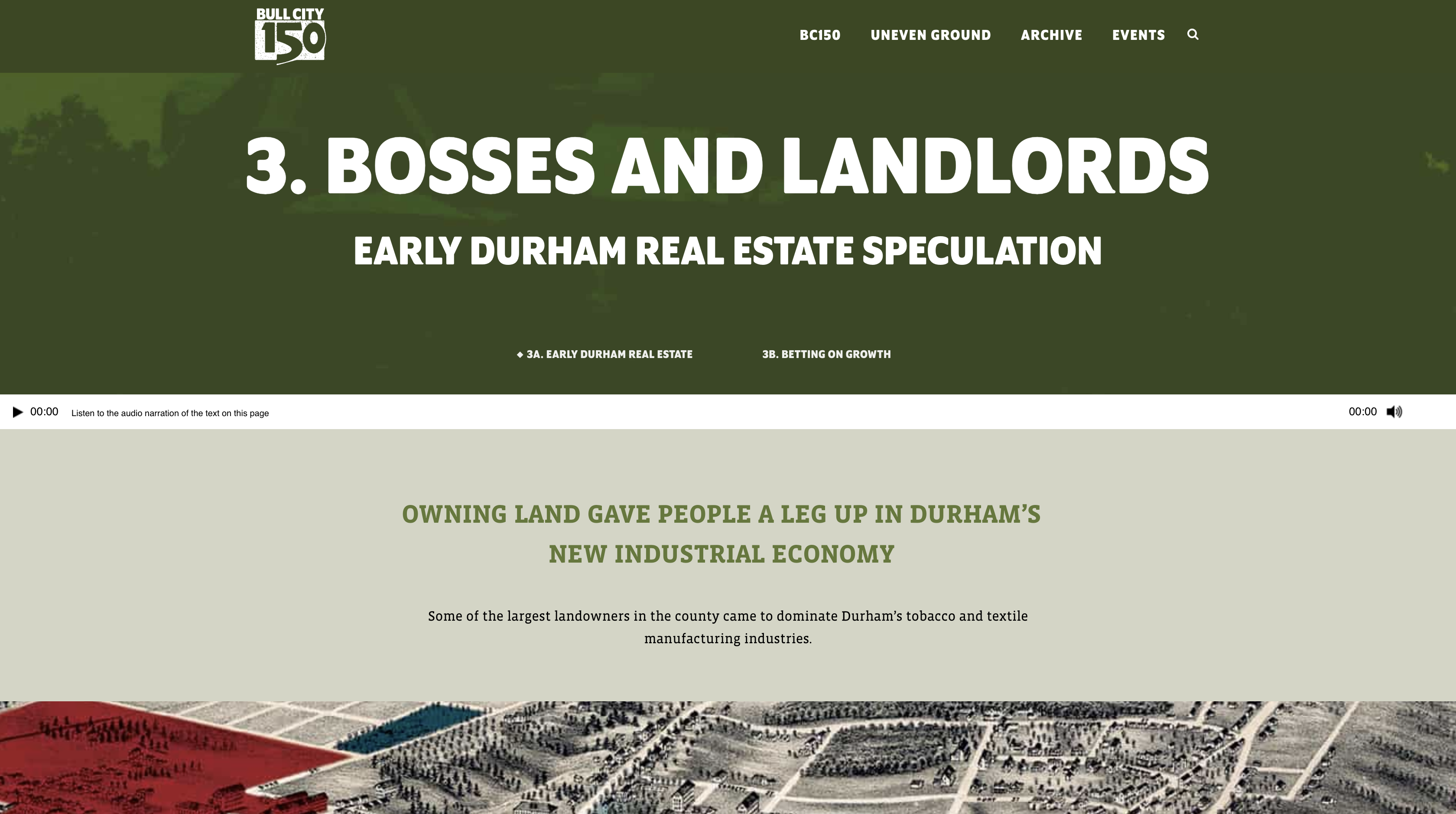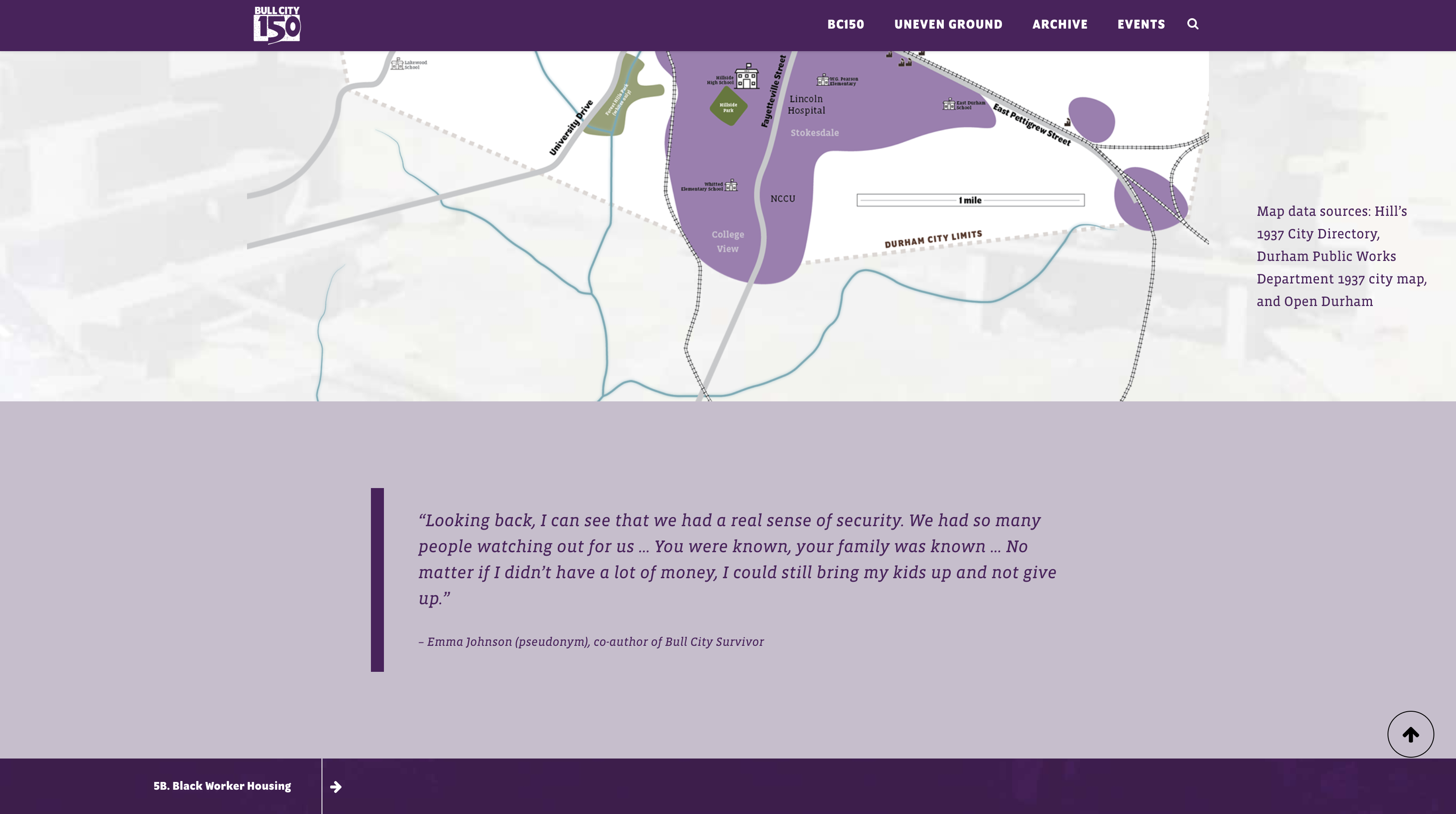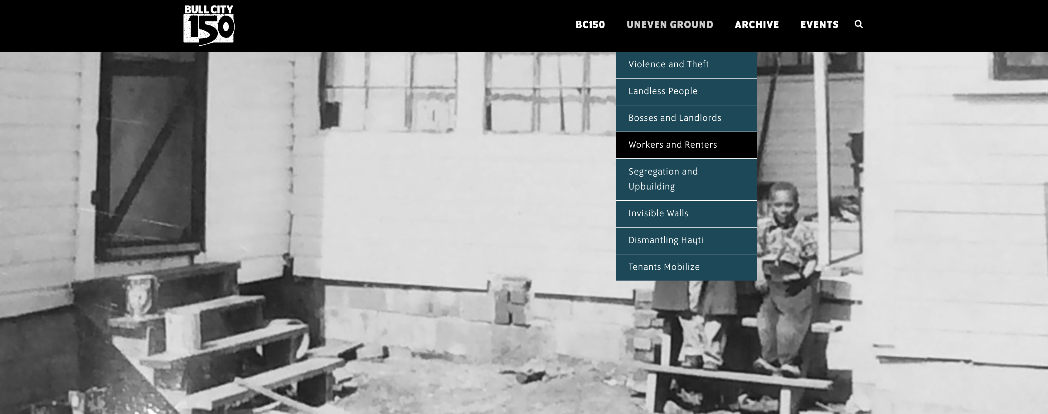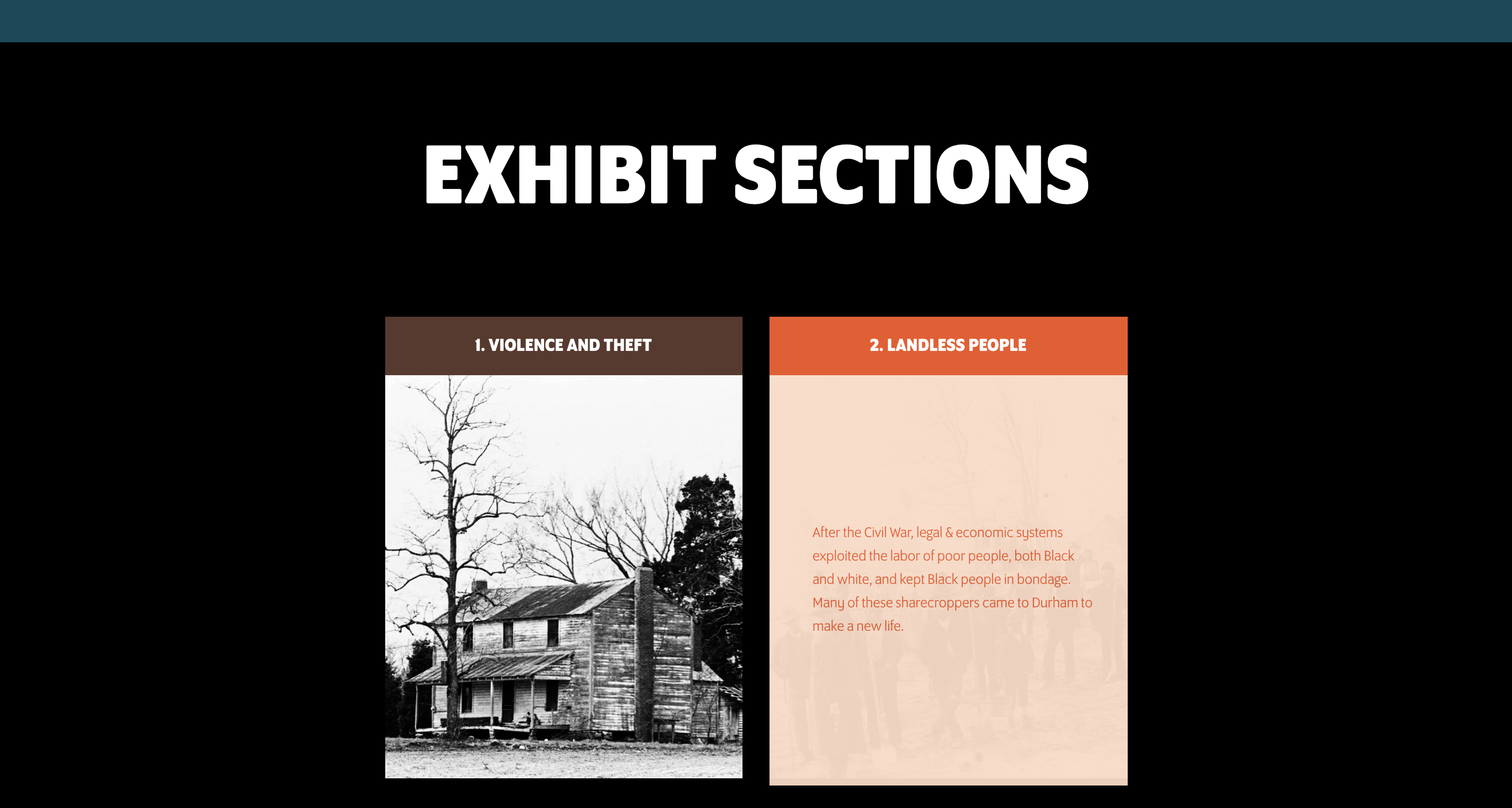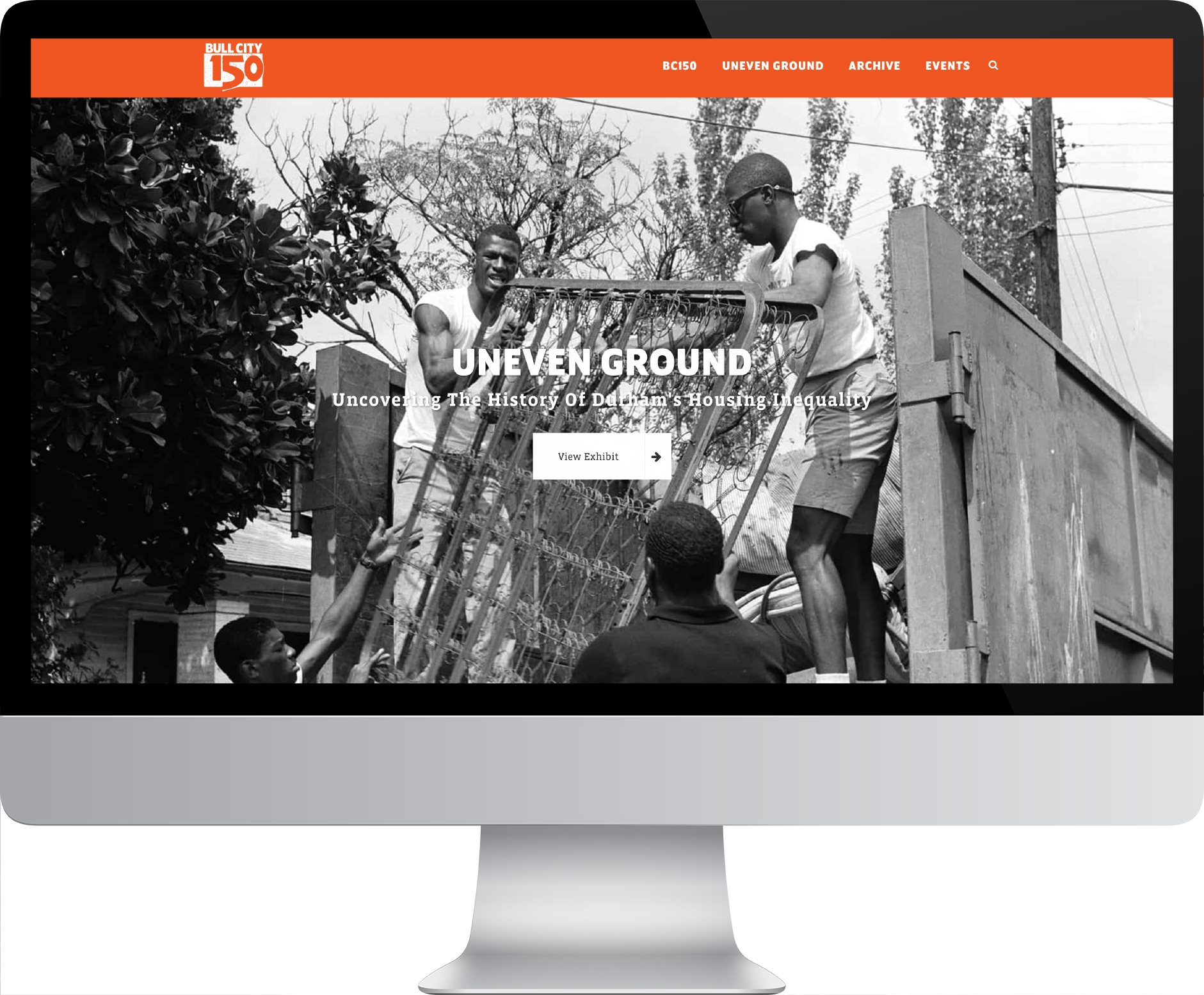 I developed an online complementary webpage for the award-winning public exhibition, Uneven Ground: the Foundations of Housing Inequality in Durham, NC. The online exhibition consists of 27 web pages that together tell a comprehensive historical narrative of Durham's Housing inequalities. I also redesigned the navigation menu for the organization's website and developed a framework for adding future exhibitions.